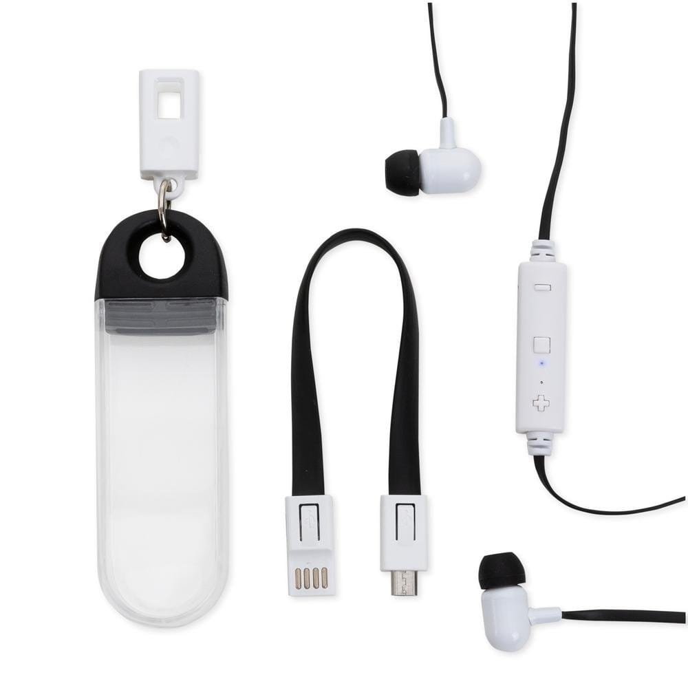 Descrição: Fone de ouvido bluetooth intra-auricular com microfone, estojo e cabo USB para carregamento. A tampa do estojo possui uma alça que pode ser removida do suporte, revelando as pontas do cabo USB.