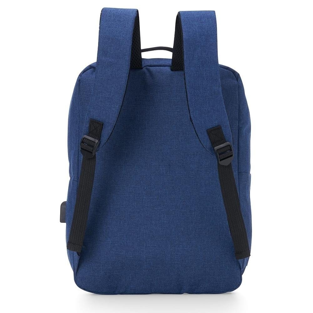 Descrição: Mochila confeccionada em nylon com compartimento para notebook até 15,6 polegadas. Contém compartimento grande com divisórias para documentos, eletrônicos e caneta, dois compartimentos frontais com abertura horizontal, bolso lateral e adaptador USB externo com cabo acoplado, permitindo a conexão de um carregador portátil de dentro da mochila e transferência da carga para o lado externo, ocultando o carregador e viabilizando a utilização do celular durante o processo. Contém zíperes com pegadores plásticos, alça de mão em nylon e alças para as costas ajustáveis com revestimento espumado antitranspirante.